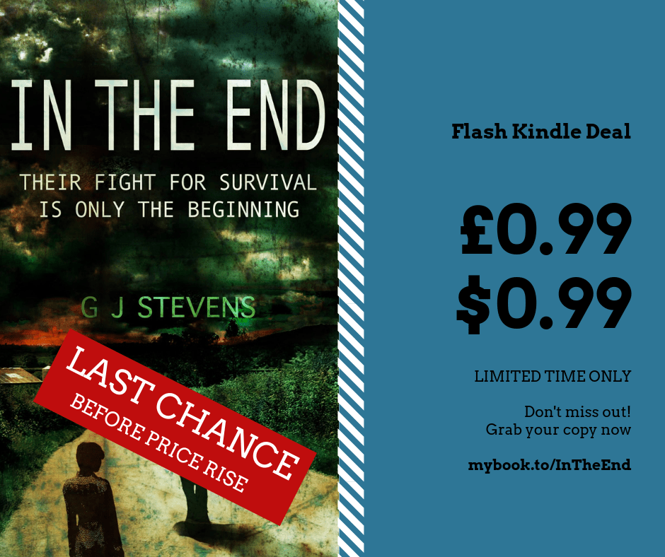 That’s it for me for this week. If you want to know what SURVIVOR is all about, all you need to do is sign up to my mailing list and you’ll get a link to a free copy the same day. If you fancy picking up a copy of IN THE END, it’s still only £1.99/$1.99 until 15th April!