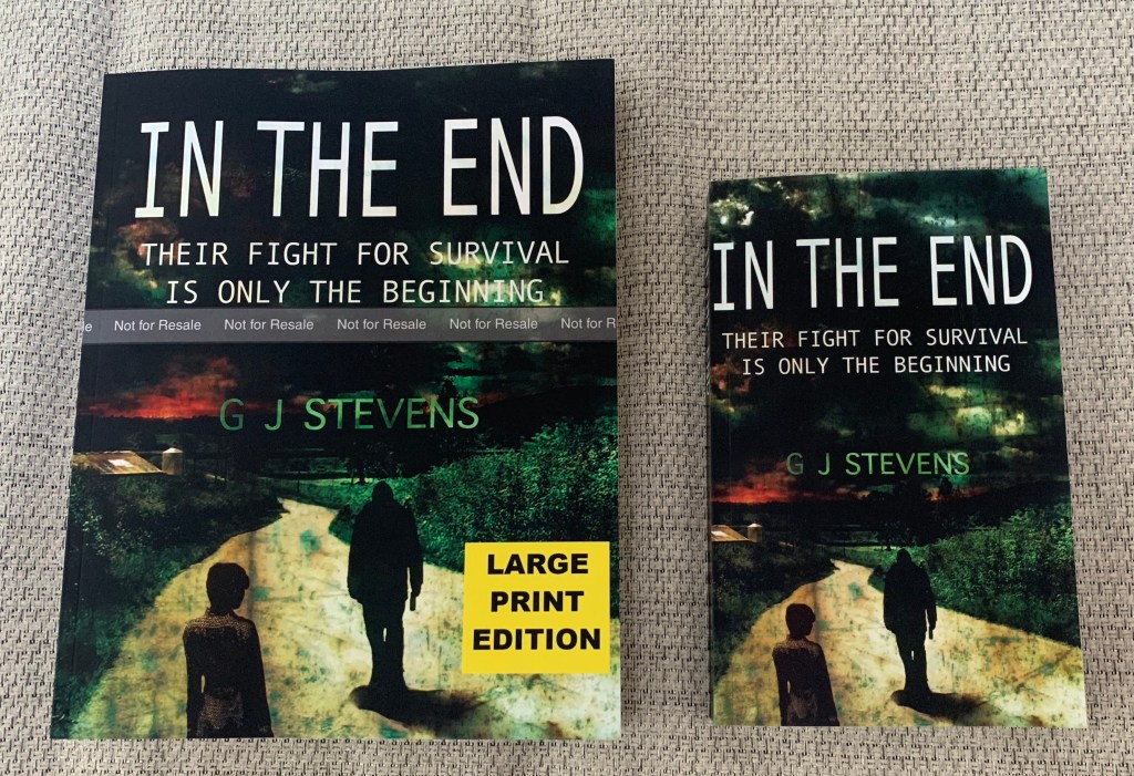 To celebrate the release of the large print edition of IN THE END, wow it’s a wopper see below, I’ve released my three short standalone scenes narrated by Jim Harbourne (the same narrator who voiced and produced my audiobook) and you can listen to them here on SoundCloud for free. I hope you get chance to check them out. If you like the style then you’ll love the audiobook!